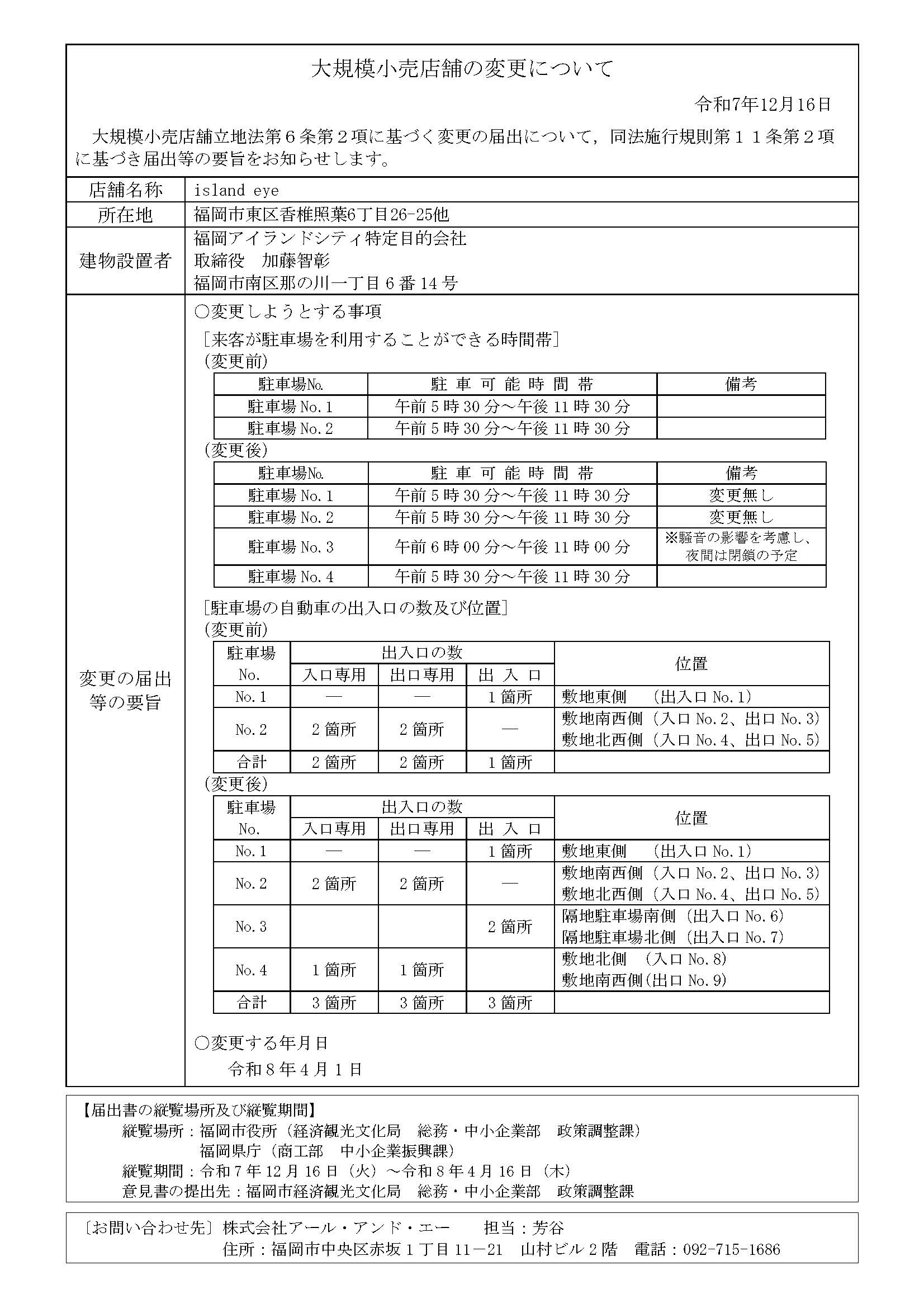 大規模小売店舗立地法第6条2項に基づく変更の届け出について、同法施行規則第11条第2項に基づき届出等の要旨を下記の通りお知らせします。
