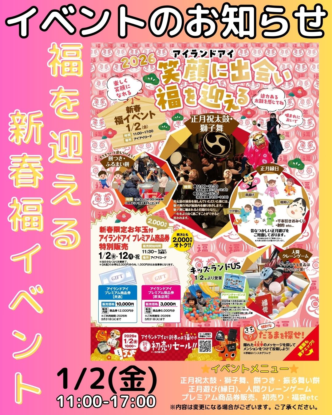 更新日:2025/12/27《2026年1月2日(金)》【福を迎える】アイランドアイ新春福イベント開催★人間クレーンゲームも初登場!?