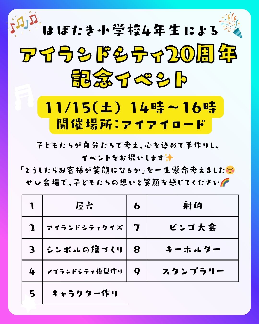 15日ははばたき小学校4年生による、アイランドシティ20周年記念のお祝いイベント、