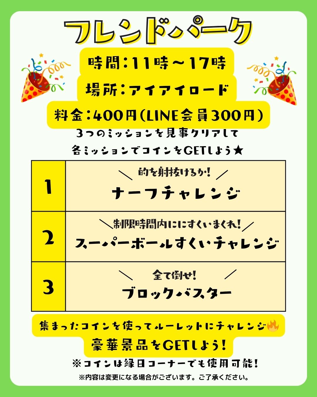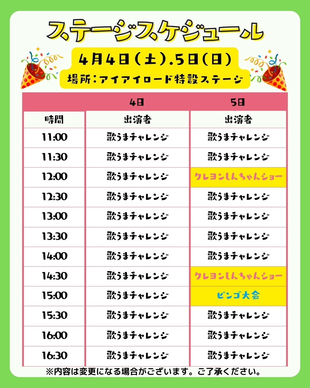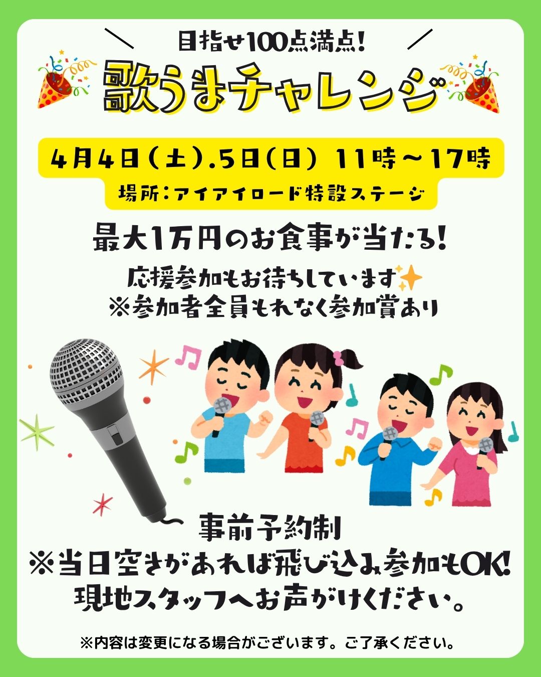 4/4(土) 11:00より予定しておりました歌うまチャレンジにつきましては、天候不良により、