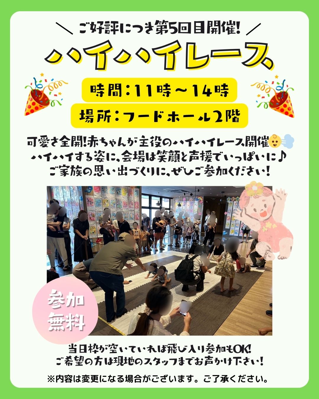 - 出場資格は「ハイハイ可能な未歩行の赤ちゃん」。