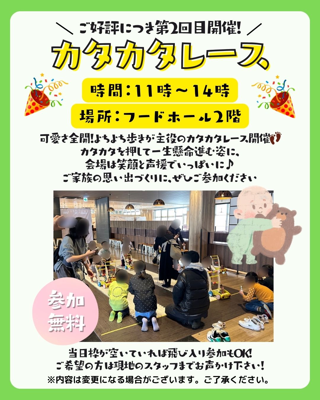 その他にも大好評!キャラクターショーやハイハイレース・カタカタレースも開催いたします!